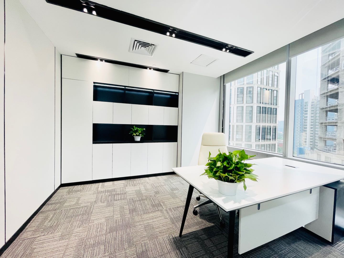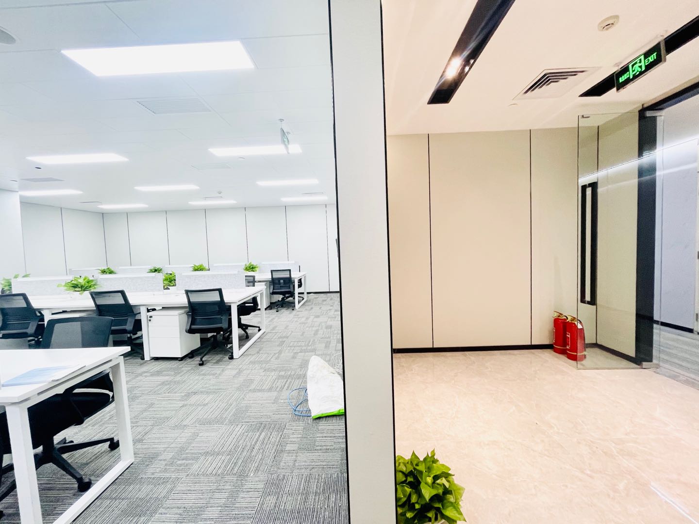 内部格局: 25-30 人工位区、【1个老板间、2个经理室、1个会议室、1个会客区】5个到顶隔断,工区宽敞明亮。