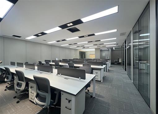 内部格局: 85 人工位区、【2个老板间、3个经理室、2个会议室、1个会客区】8个到顶隔断、工区宽敞明亮。