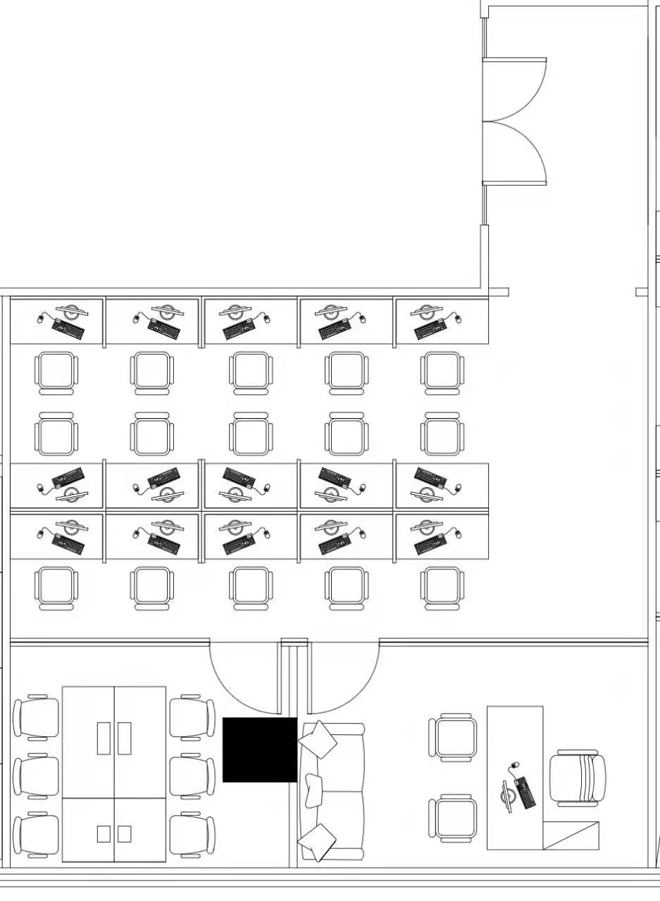 内部格局: 17-22人工位区、【1个老板间、1个经理室、1个会议室】3个到顶隔断、工区宽敞明亮。