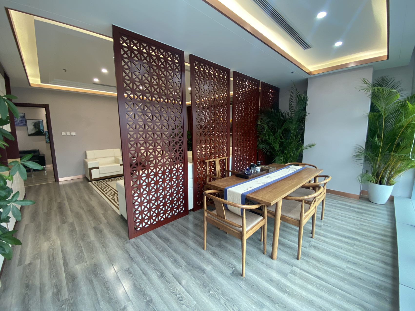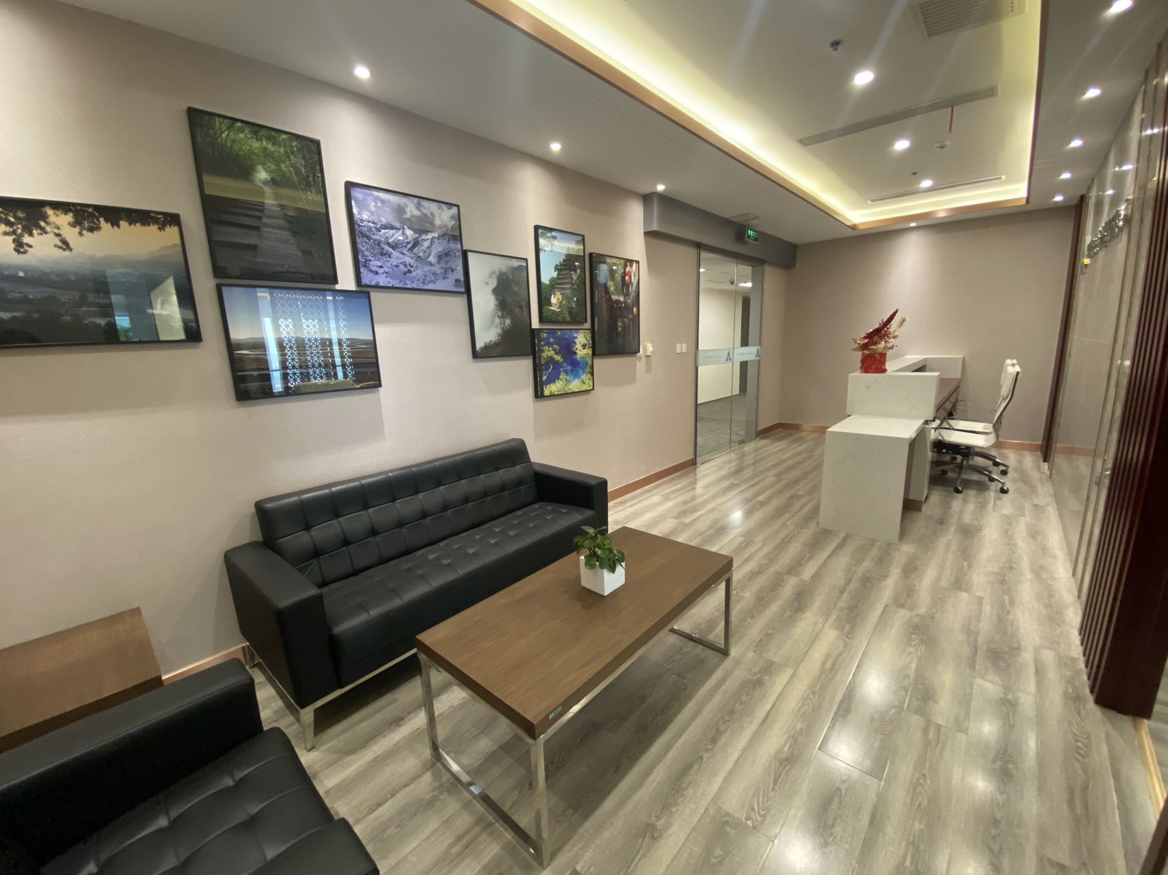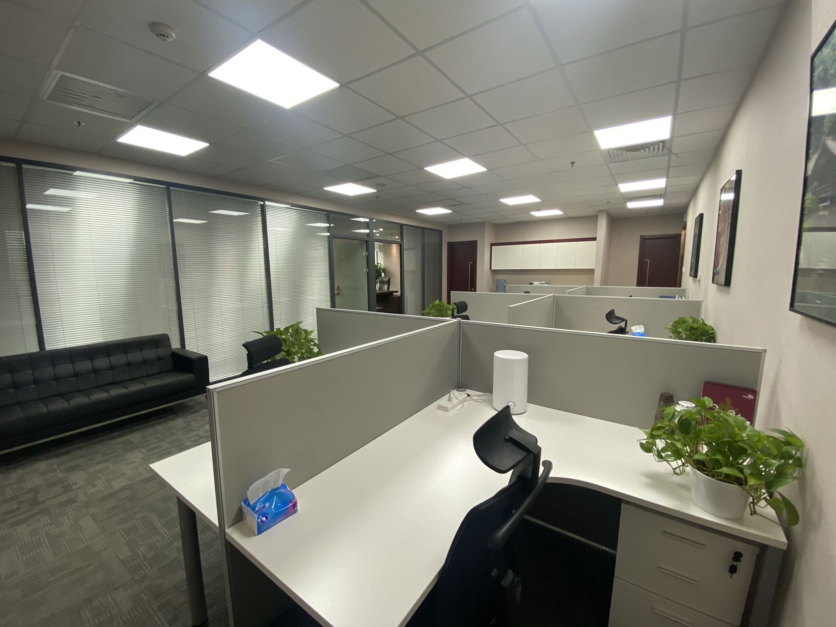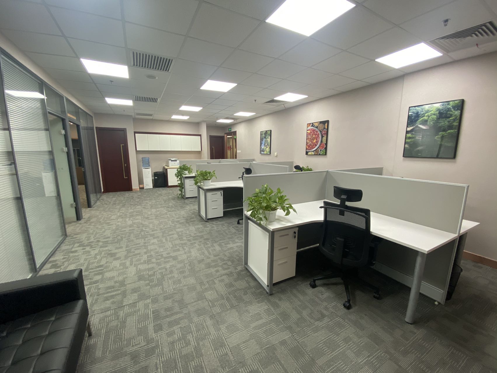 内部格局: 25-30 人工位区、【1个老板间、2个经理室、1个会议室、1个会客区】5个到顶隔断、25-30人工位区,工区宽敞明亮。