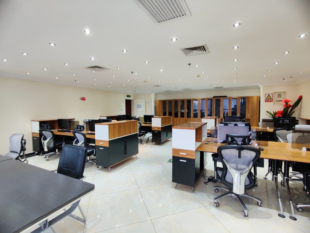 内部格局: 37-42人工位区、【2个老板间、3个经理室、2个会议室、1个会客区】8个到顶隔断,工区宽敞明亮。
