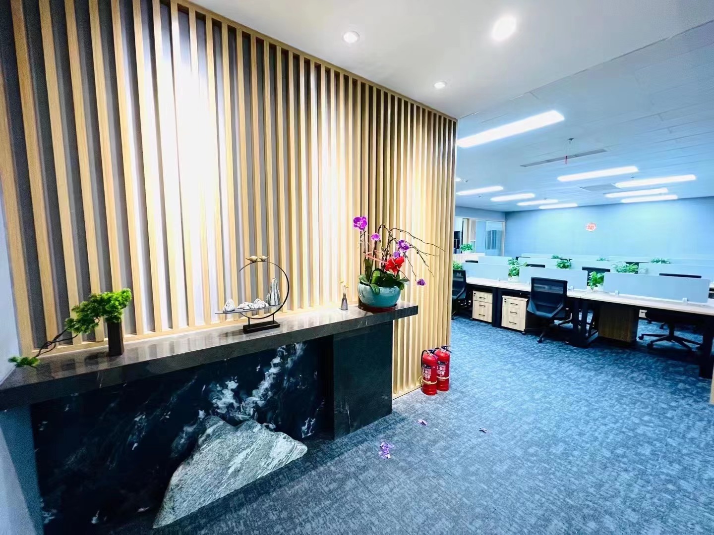 内部格局: 25-30人工位区、【1个老板间、2个经理室、1个会议室、1个会客区】5个到顶隔断,工区宽敞明亮。