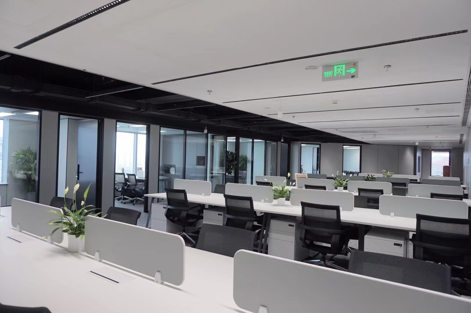 内部格局: 41-49人工位区、【2个老板间、3个经理室、1个会议室、1个会客区】7个到顶隔断,工区宽敞明亮。