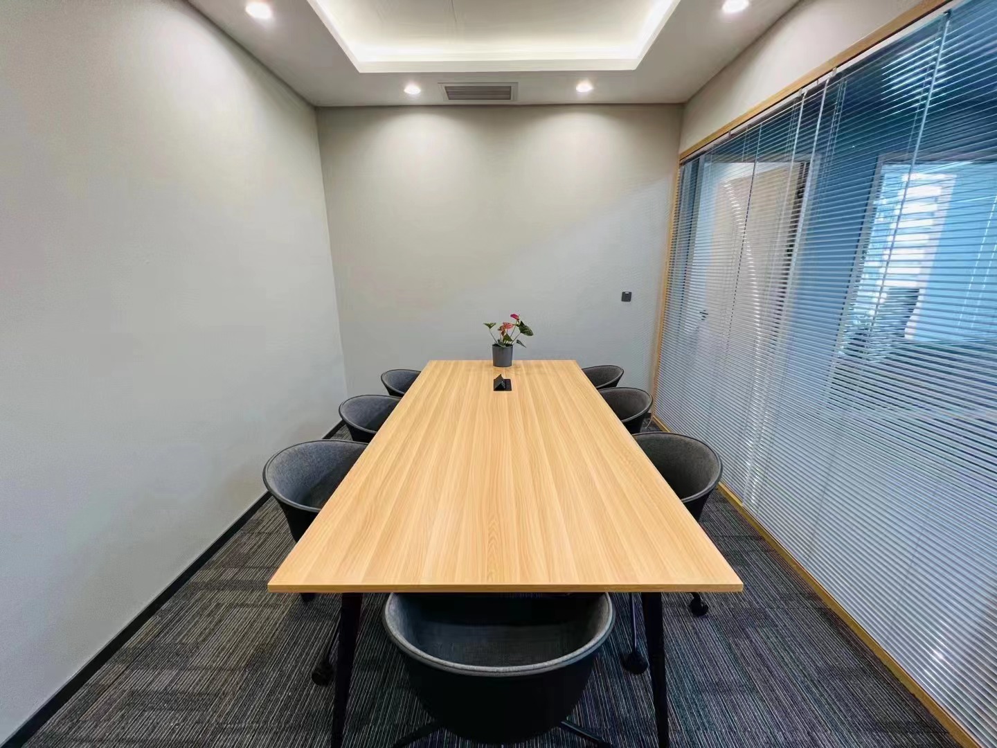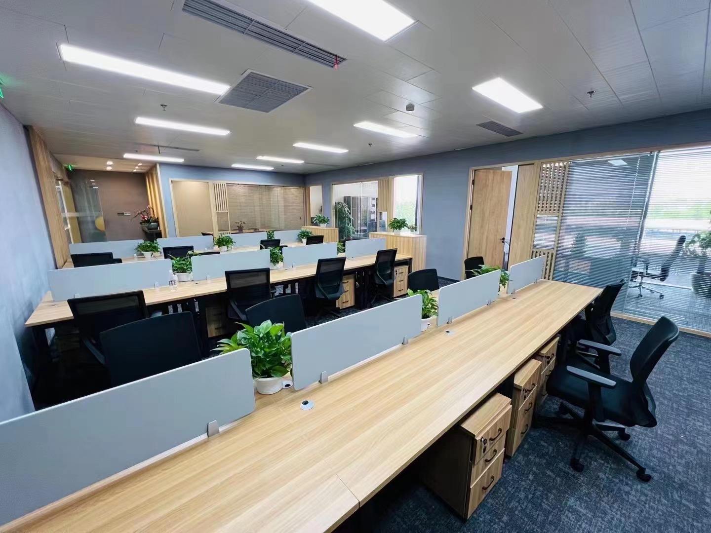 内部格局: 25-30人工位区、【2个老板间、4个经理室、2个会议室、1个会客区】9个到顶隔断,工区宽敞明亮。