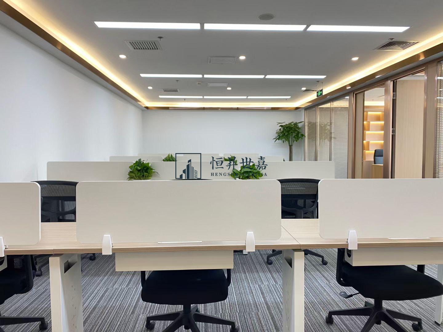 内部格局: 17-22人工位区、【1个老板间、1个经理室、1个会议室】3个到顶隔断,工区宽敞明亮。